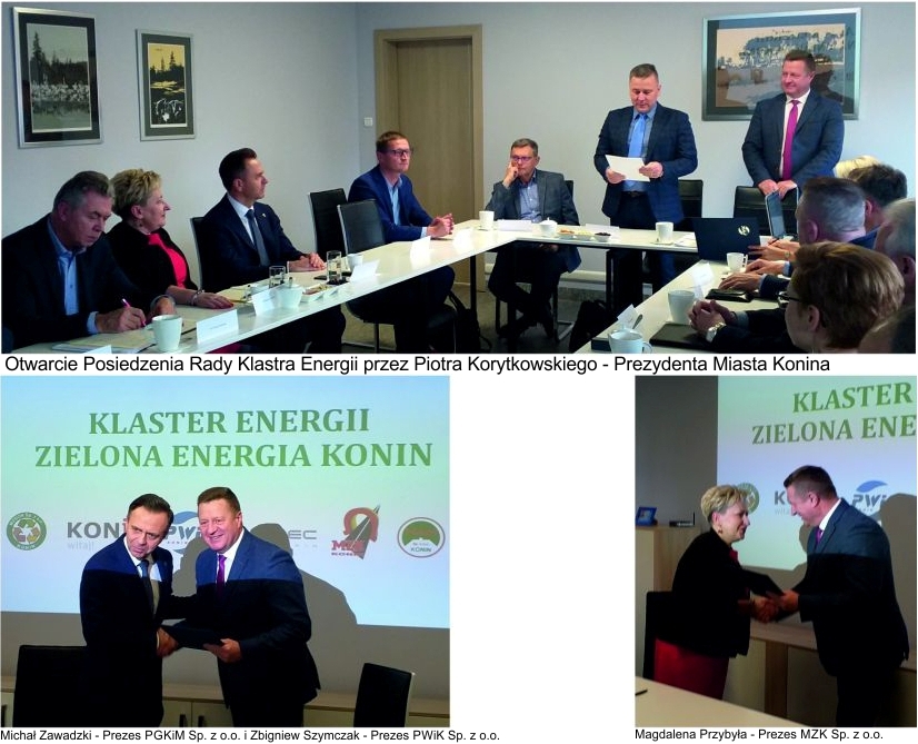 22 listopada 2019 roku odbyło się posiedzenie Rady Klastra Energii „Zielona Energia Konin" podczas, którego jednogłośnie przyjęto dwóch nowych uczestników, tj. Miejski Zakład Komunikacji Sp. z o.o. oraz Przedsiębiorstwo Gospodarki Komunalnej i Mieszkaniowej Sp. z o.o. w Koninie. Klaster został powołany w połowie 2018 roku z inicjatywy Przedsiębiorstwa Wodociągów i Kanalizacji Sp. z o.o. i ma za zadanie integrować potencjały oraz podmioty związane z rynkiem energetycznym, a w szczególności rynkiem Odnawialnych Źródeł Energii. Dzięki aktywnemu uczestnictwu spółek miejskich oraz miasta Konina możliwe będzie bilansowanie zarządzania energią poprzez stworzenie sieci współpracy na rzecz zmian w obszarze gospodarki niskoemisyjnej. Klaster to tworzenie warunków do rozwoju zeroemisyjnych technologii i wykorzystania naturalnych zielonych zasobów centralnej lokalizacji miasta. Już dziś PWiK Sp. z o.o. ma największą w mieście instalację fotowoltaiczną o mocy 100 kW, co pozwala na obniżanie kosztów działalności przedsiębiorstwa, zwiększa bezpieczeństwo energetyczne i pozytywnie wpływa na środowisko. Podmioty wchodzące w skład Klastra mogą być zarówno producentem energii, jaki odbiorcą, co w przyszłości zwiększy bezpieczeństwo energetyczne spółek. Główne cele jakie postawili sobie uczestnicy Klastra to między innymi: budowa ciepłowni geotermalnej, kolejnych instalacji fotowoltaicznych na terenie PWiK, MZGOK, PGKiM i MPEC, regionalnej instalacji zagospodarowania osadów ściekowych i produkcja biogazu, modernizacja Stacji Uzdatniania Wody wraz z budową pompy ciepła i hybrydowego systemu magazynowania energii, przebudowa systemu ciepłowniczego miasta Konina, uruchomienie zamkniętego systemu fermentacji i kompostowania odpadów biodegradowalnych, budowa linii średniego napięcia łączących uczestników Klastra. Realizacja tych inwestycji ma prowadzić do samowystarczalności energetycznej i zaspokojenia potrzeb na energię wszystkich podmiotów w obrębie Klastra. Zgodnie z Uchwałą nr 1/2021 Rady Klastra Energii od dnia 10.11.2021 r. koordynatorem KE ZEK jest Miejski Zakład Gospodarki Odpadami Komunalnymi Sp. z o.o. w Koninie.