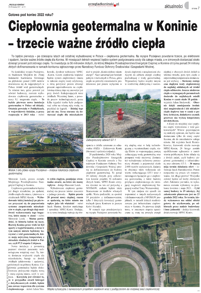 2021-03-24 Ciepłownia geotermalna w Koninie – trzecie ważne źródło ciepła Zapraszamy serdecznie do lektury najnowszego artykułu, który ukazał się w tygodniku „Przegląd Koniński” (numer 12, 23-29 marca 2021). Artykuł jest dostępny poniżej: Artykuł w Przeglądzie Konińskim z 23-29 marca 2021r. nr 12. (397.8 KiB)