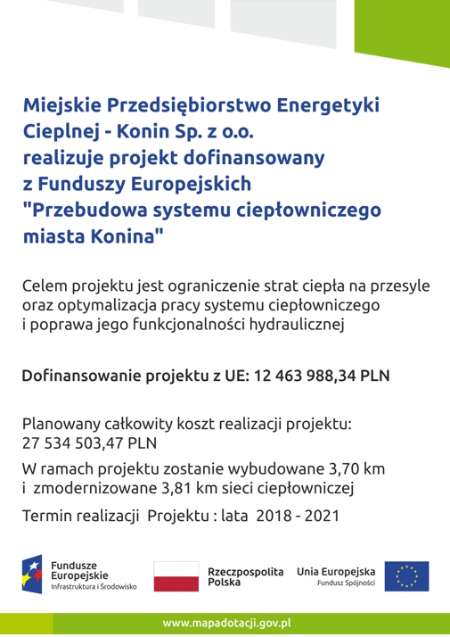 Miejskie Przedsiębiorstwo Energetyki Cieplnej - Konin Sp. z o. o. zawarło z Narodowym Funduszem Ochrony Środowiska i Gospodarki Wodnej w Warszawie umowę o dofinansowanie Projektu „Przebudowa systemu ciepłowniczego miasta Konina” w ramach działania 1.5 Efektywna dystrybucja ciepła i chłodu, oś priorytetowa I Zmniejszenie emisyjności gospodarki Programu Operacyjnego Infrastruktura i Środowisko 2014 – 2020.