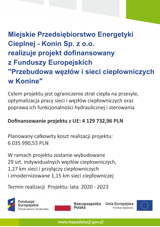 Trwają prace przy przebudowie sieci ciepłowniczej w ul. Leśnej i Okólnej, na które Miejskie Przedsiębiorstwo Energetyki Cieplnej – Konin Sp. z o.o zawarło z Narodowym Funduszem Ochrony Środowiska i Gospodarki Wodnej w Warszawie umowę o dofinansowanie Projektu „Przebudowa węzłów i sieci ciepłowniczych w Koninie” w ramach działania 1.5 Efektywna dystrybucja ciepła i chłodu, oś priorytetowa I Zmniejszenie emisyjności gospodarki Programu Operacyjnego Infrastruktura i Środowisko 2014 – 2020.