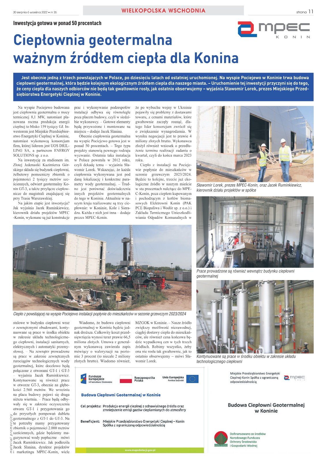 2022-08-29 Ciepłownia geotermalna ważnym źródłem ciepła dla Konina Zapraszamy serdecznie do lektury najnowszego artykułu, który ukazał się w tygodniku „Przegląd Koniński” (numer 35, 30 sierpnia - 5 września 2022). Artykuł jest dostępny poniżej: Artykuł w Przeglądzie Konińskim, 30 sierpnia - 5 września 2022 r. nr 35. (683.2 KiB)
