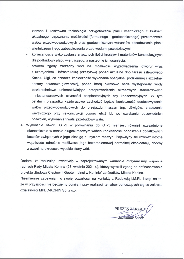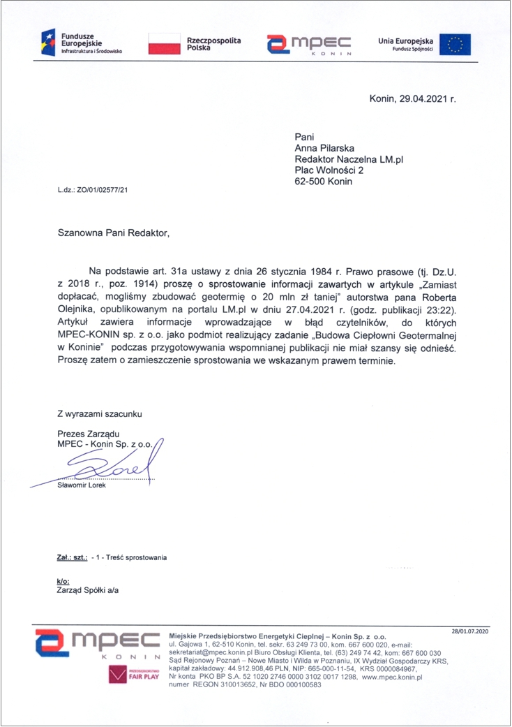 Sprostowanie informacji zawartych w artykule „Zamiast dopłacać, mogliśmy zbudować geotermię o 20 mln zł taniej” autorstwa pana Roberta Olejnika, opublikowanym na portalu LM.pl w dniu 27.04.2021 r. (godz. publikacji 23:22).