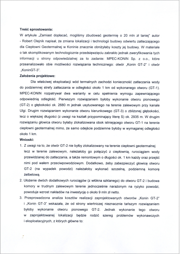 Artykuł zawiera informacje wprowadzające w błąd czytelników, do których MPEC-KONIN sp. z o.o. jako podmiot realizujący zadanie „Budowa Ciepłowni Geotermalnej w Koninie” podczas przygotowywania wspomnianej publikacji nie miał szansy się odnieść.