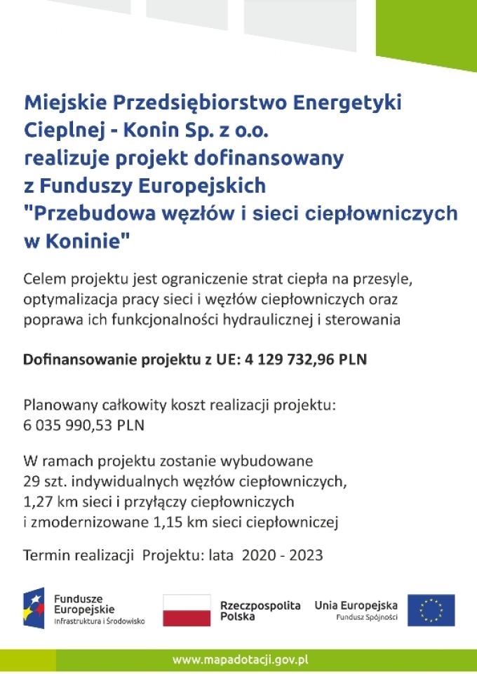 W dniu 4 sierpnia 2020 roku Miejskie Przedsiębiorstwo Energetyki Cieplnej – Konin Sp. z o. o. o podpisało umowę z Narodowym Funduszem Ochrony Środowiska i Gospodarki Wodnej na dotację bezzwrotną dla Spółki na dofinansowanie przebudowy grupowych węzłów na osiedlu Zatorze, osiedlu Sikorskiego oraz sieci ciepłowniczej na ul. Leśnej. Dotacja na kwotę 4.129.732,96 zł stanowi aż 85% całkowitych kosztów inwestycji. Uzyskanie dotacji było rezultatem intensywnych przygotowań Spółki do przeprowadzenia inwestycji, przygotowaniem koncepcji, złożeniem Wniosku o dofinansowanie zadania „Przebudowa węzłów i sieci ciepłowniczych w Koninie” w ramach projektu Działanie 1.5 Efektywna dystrybucja ciepła i chłodu, konkurs zamknięty nr POIŚ.01.05.00-IW.03-00-K05/19. Przedsięwzięcie to polegać będzie na przebudowie sieci ciepłowniczej ul. Leśnej, likwidacji węzłów grupowych i sieci niskoparametrowych, budowie węzłów ciepłowniczych indywidualnych oraz budowie i przebudowie sieci wysokoparametrowych w ramach likwidacji węzłów grupowych. Zlikwidowanych zostanie 8 węzłów grupowych, z czego 7 na osiedlu Zatorze, 1 na osiedlu Sikorskiego, a w ich miejsce powstanie 29 węzłów indywidualnych. Projekt realizowany będzie w latach 2020 – 2023 i zapewni poprawę efektywności oraz zmniejszenie awaryjności sieci w powyższych lokalizacjach. Dzięki zastosowaniu nowoczesnych rozwiązań z zakresu automatyki ciepłowniczej możliwa będzie niezależna regulacja i rozliczanie zużywanego ciepła dla każdego obiektu.