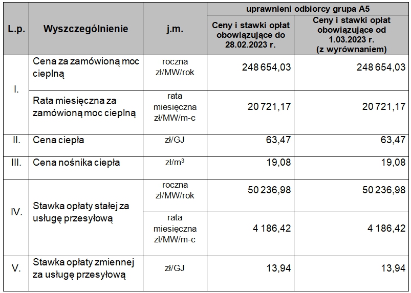 W związku z wejściem w życie ustawy z dnia 8 lutego 2023 r. o zmianie ustawy o szczególnych rozwiązaniach w zakresie niektórych źródeł ciepła w związku z sytuacją na rynku paliw oraz niektórych innych ustaw (Dz. U. 2023 poz. 295) oraz opublikowaniem przez Prezesa URE maksymalnych cen dostaw ciepła (informacja nr 9/2023 z dn. 22.02.2023 r.) MPEC-Konin Sp. z o.o. wprowadza do stosowania od 1 marca 2023 r. dla uprawnionych odbiorców z grupy A5 wymienionych w art. 4 ust. 1 ww. ustawy, następujące ceny i stawki opłat za ciepło (stawki nie ulegają zmianie):