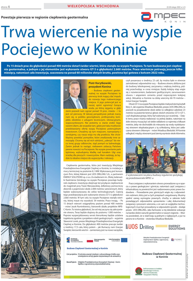 2022-02-22 Trwa wiercenie na wyspie Pociejewo. Zapraszamy serdecznie do lektury najnowszego artykułu, który ukazał się w tygodniku „Przegląd Koniński” (numer 8, 22-28 lutego 2022). Artykuł jest dostępny poniżej: Artykuł w Przeglądzie Konińskim z 22-28 lutego 2022 r. nr 8. (484.5 KiB)