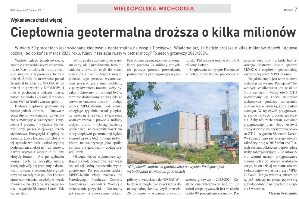 2022-08-09 Ciepłownia geotermalna droższa o kilka milionów. Zapraszamy serdecznie do lektury najnowszego artykułu, który ukazał się w tygodniku „Przegląd Koniński” (numer 32, 9-15 sierpnia 2022). Artykuł jest dostępny poniżej: Artykuł w Przeglądzie Konińskim z 9-15 sierpnia 2022 r. nr 32. (1.9 MiB)