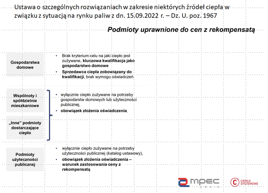 MPEC-Konin Sp. z o.o. informuje, że zgodnie z ustawą z dnia 15 września 2022 r. o szczególnych rozwiązaniach w zakresie niektórych źródeł ciepła w związku z sytuacją na rynku paliw (Dz. U. 2022 poz. 1967) odbiorcy ciepła, o których mowa w art. 4 ust. 1 pkt 2, 3, 4 składają oświadczenia do sprzedawcy ciepła, zawierające szacowane ilości zużywanego ciepła w rozbiciu na kolejne miesiące od 1 października 2022 r. do 30 kwietnia 2023 r.