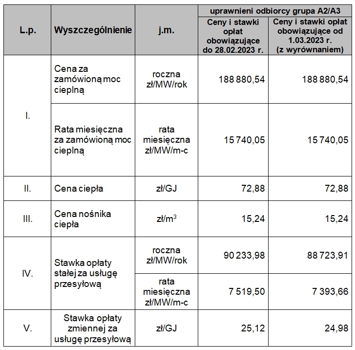 W związku z wejściem w życie ustawy z dnia 8 lutego 2023 r. o zmianie ustawy o szczególnych rozwiązaniach w zakresie niektórych źródeł ciepła w związku z sytuacją na rynku paliw oraz niektórych innych ustaw (Dz. U. 2023 poz. 295) oraz opublikowaniem przez Prezesa URE maksymalnych cen dostaw ciepła (informacja nr 9/2023 z dn. 22.02.2023 r.) MPEC-Konin Sp. z o.o. wprowadza do stosowania od 1 marca 2023 r. dla uprawnionych odbiorców z grupy A2/A3 wymienionych w art. 4 ust. 1 ww. ustawy, następujące ceny i stawki opłat za ciepło: