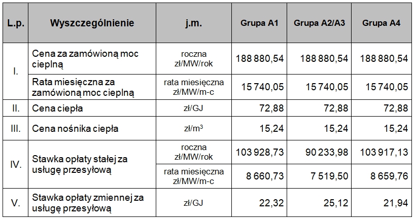 Ceny i stawki opłat dla pozostałych grup oraz odbiorców z grupy A2/A3 nie wymienionych w art. 4 ust. 1 ustawy pozostają bez zmian (tabela poniżej).
