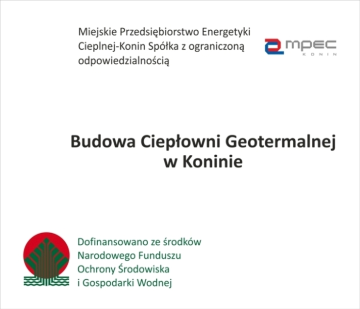 - Projekt pn. „Budowa Ciepłowni Geotermalnej w Koninie” jest finansowany w ramach wsparcia dotyczącego poddziałania 1.1.1 Wspieranie inwestycji dotyczących wytwarzania energii z odnawialnych źródeł wraz z podłączeniem tych źródeł do sieci dystrybucyjnej/przesyłowej, oś priorytetowa I Zmniejszenie emisyjności gospodarki Programu Operacyjnego Infrastruktura i Środowisko 2014-2020.