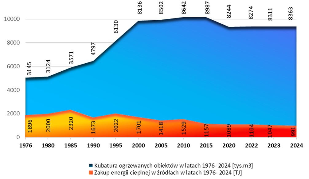 Wzrost kubatury ogrzewanych zasobów mieszkaniowych wiąże się z podłączeniem do miejskiej sieci ciepłowniczej nowych obiektów.